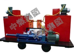 主泵用来输送已加入促凝剂的水。辅泵用来输送液态纯胶(如水玻璃)。这两种液料经各自的输送胶管输送到混合器中均匀混合后,经三个出液口送出。根据各料的配比不同,这种液态的高水胶料混合液可在30~400秒内形成固态胶体,用于煤矿灭火和防火。